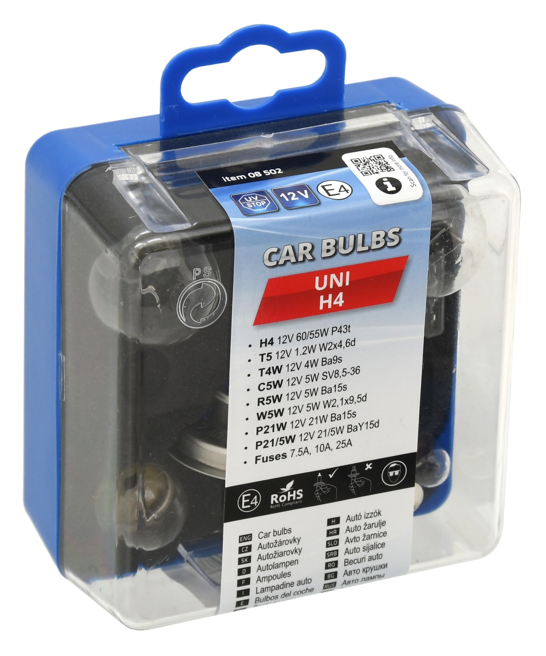Plastová krabička náhradních autožárovek a pojistek, homologace E. Balení obsahuje: 1ks H4 12V 60/55W P43t1ks T5 - 12V 1.2W W2x4,6d1ks T4W - 12V 4W Ba9s1ks C5W - 12V 5W SV8,5-361ks R5W - 12V 5W Ba15s1ks W5W - 12V 5W W2,1x9,5d1ks P21W - 12V 21W Ba15s1ks P21/5W - 12V 21/5W BaY15d3ks pojistka nožová przeczytaj całość