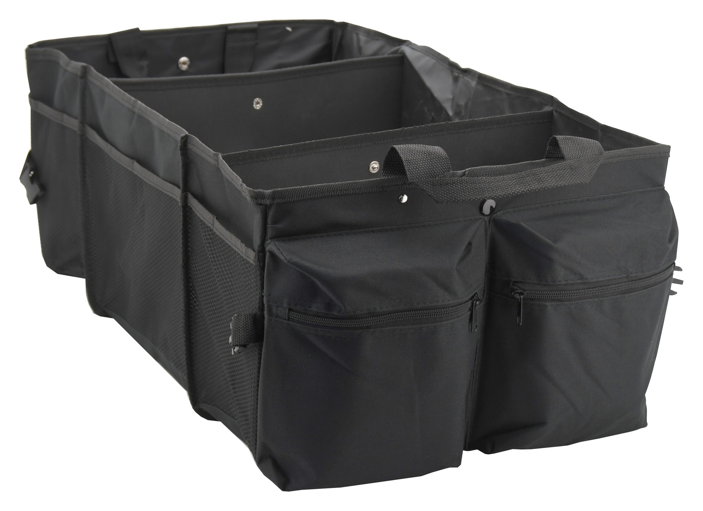 Skládací, třídílný organizér do kufru automobilu o objemu 80L. Organizér s rozměry 69 x 29 x 41 cm je zhotoven z kvalitně obšitého 100% polyesteru. Čelní strana je opatřena dvěma objemnými kapsami, zadní strana objemnou kapsou na suchý zip. Na jedné straně je organizér doplněn o sítěnou kapsu a...