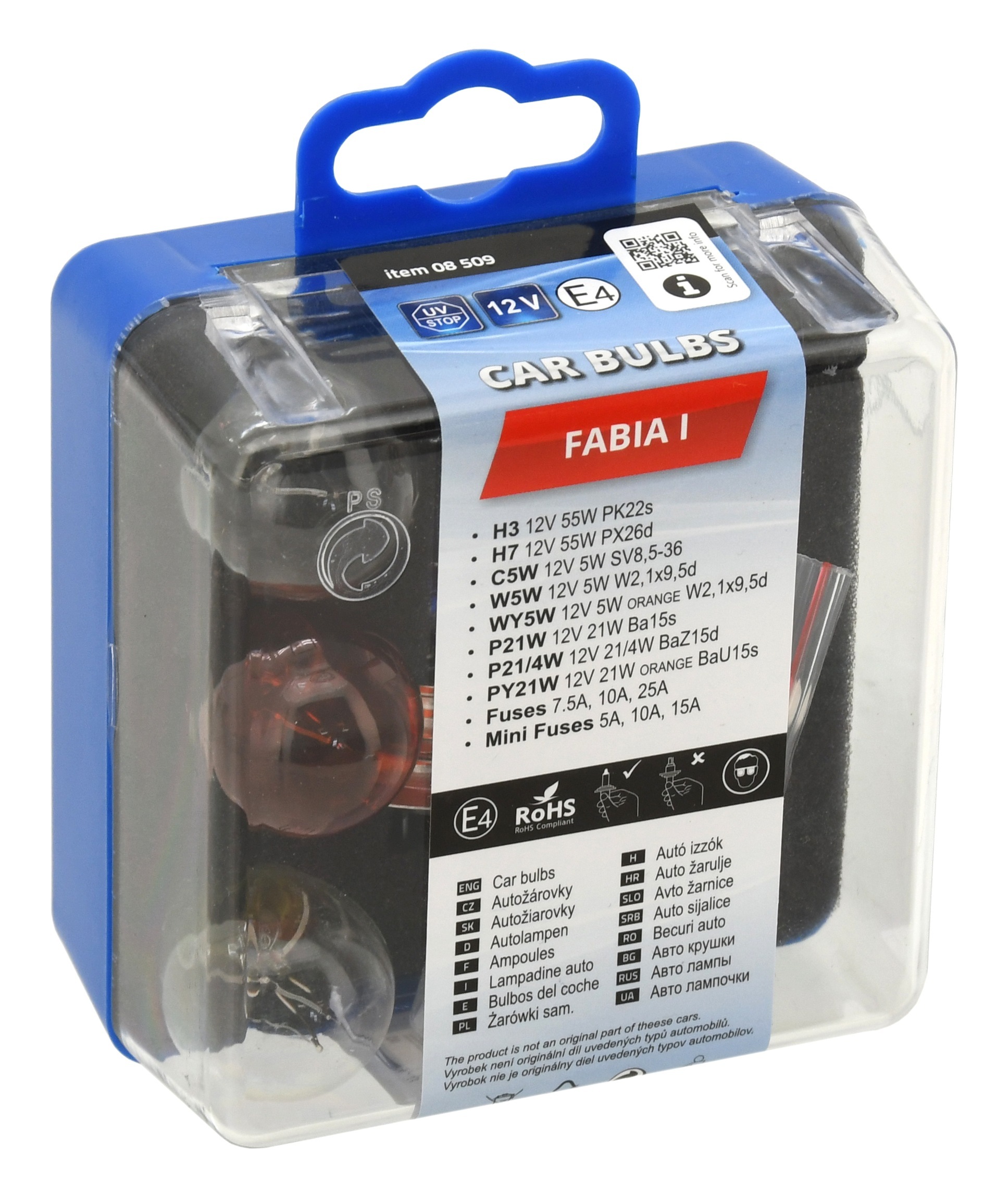 Plastowe pudełko z zapasowymi żarówkami samochodowymi i bezpiecznikami, homologacja E.