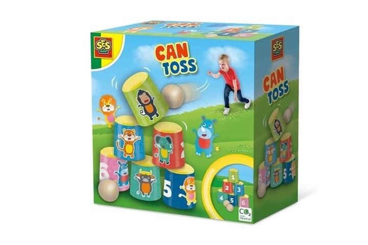 Rzut puszką! Dzięki tej grze dzieci mogą bez końca bawić się na świeżym powietrzu. Plastikowe kubki można ustawić w różnych pozycjach, z liczbami lub zwierzętami skierowanymi do przodu. Kto może przewrócić najwięcej puszek za pomocą dwóch drewnianych kulek i osiągnąć najwyższy wynik? Zestaw zawiera 6 plastikowych kubków i 2 drewniane piłki.