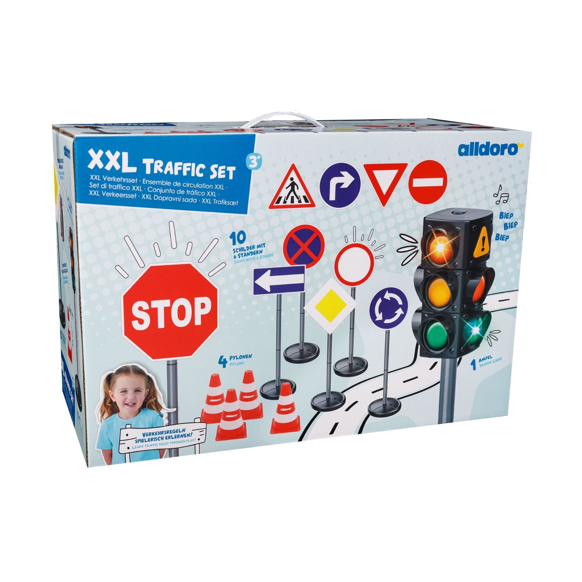 Velký dopravní set s 10 značkami se 6 stojany, 1 semaforem se světelnou a zvukovou funkcí a 4 stožáry. Výška semaforu cca 70 cm, výška značek cca 75 cm, s širokými podstavci odolnými proti převrácení, které lze naplnit vodou. Jednotlivé fáze semaforu lze měnit ručně i automaticky. Baterie pro semafor (3 x 1,5 AAA) nejsou součástí balení.