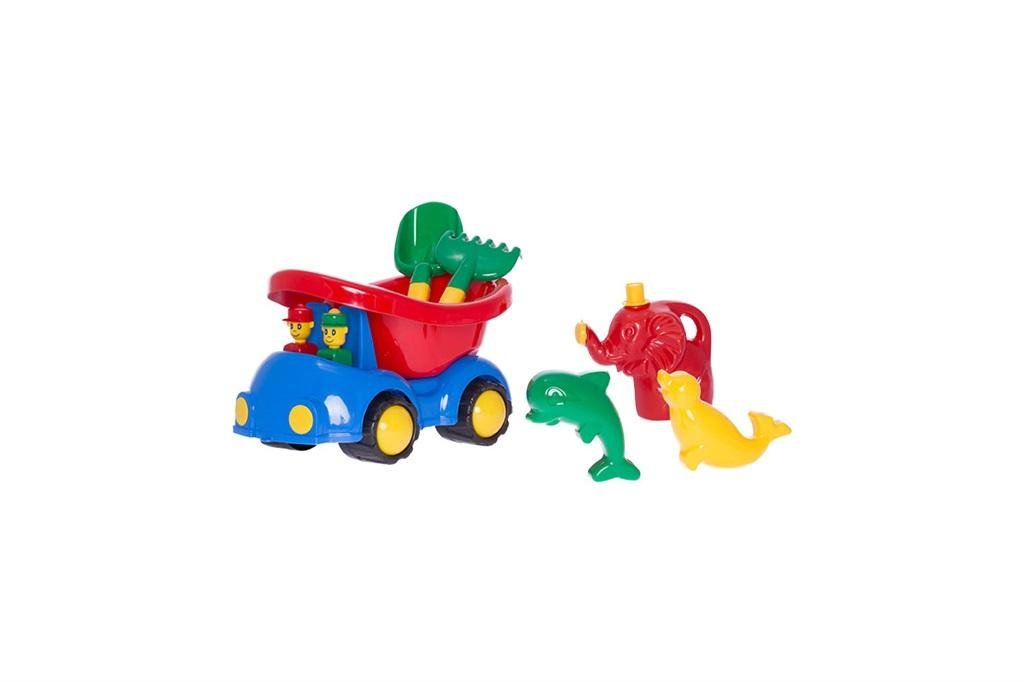 Samochód ptyś z dodatkami do piasku i konewka