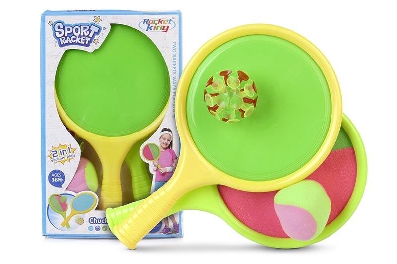 W zestawie:2 rakietki 32 x 19,5 cm, które po jednej stronie mają gładką powierzchnię, a po drugiej rzep,1 miękka piłeczka,1 piłeczka na przyssawki. przeczytaj całość