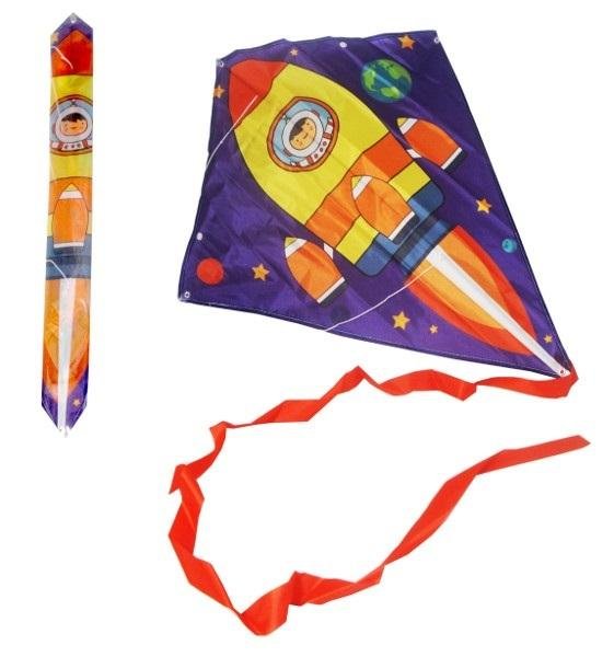 Kolorowy latawiec z wizerunkiem rakiety kosmicznej do puszczania podczas słonecznych, trochę wietrznych dni. Produkt zapakowany w przezroczysty worek. Produkt dla dzieci od 3 lat. przeczytaj całość