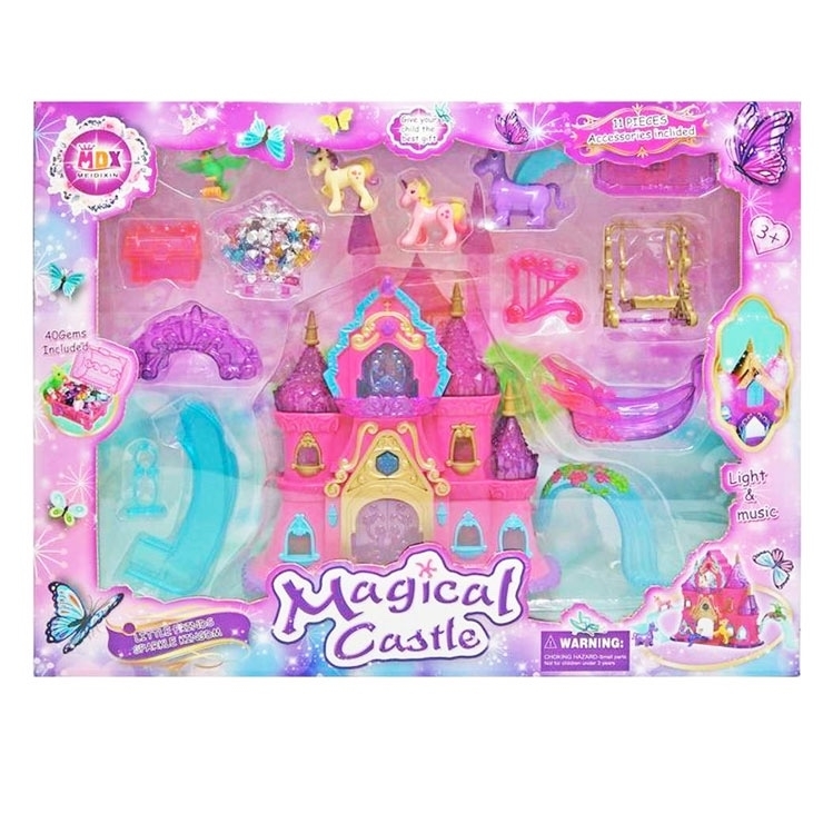 Vstup do zázračné země koníků. Jejich příbytkem je zámek, kde se baví od rána do večera. Po vyjmutí pojistky na zadní straně zámku a stisknutí tlačítka ve tvaru vločky nad otevíracími dveřmi, uslyšíš příjemné a známé melodie. Hračka vyžaduje 2ks 1,5V baterií typu AAA, které jsou součástí balení. Nevhodné pro děti do 3 let.