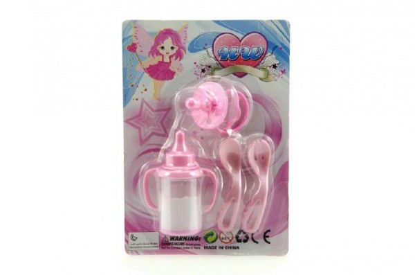 Kojenecká lahvička pro panenky s mlékem+dudlík+lžičky plast na kartě 14x20cm