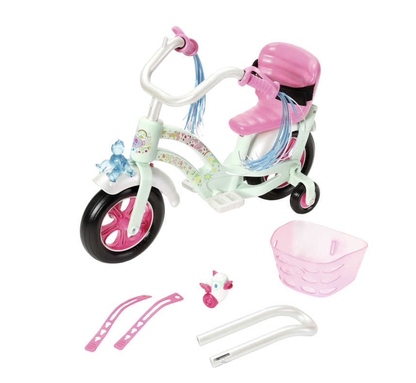 BABY born se tak ráda projíždí na kole. Propracovaný design kola je všechno možné, jenom ne nuda. Bíle lakovaný základ, mentolově zvýrazněné nejdůležitější části, květinový vzor a růžový střed kol. Ozdobné střapce na řídítkách si vesele vlají ve větru a modré světýlko ve tvaru medvídka Bruna...