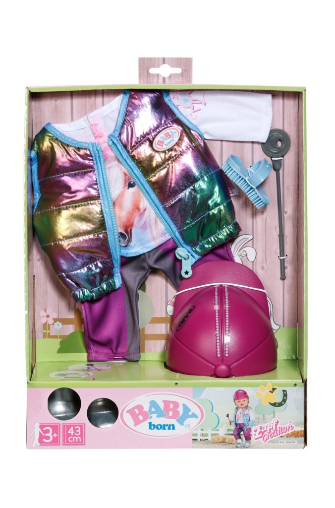 Na dzień w stajni mała jeźdźczyni potrzebuje odpowiedniego ubrania: koszulki z długim rękawem, kamizelki, żeby było jej ciepło podczas jazdy, bryczesów i butów jeździeckich, aby mogła bezpiecznie siedzieć w siodle. Oczywiście nie może zabraknąć także odpowiedniego kasku. Pomyślano również o koniku BABY born. W skład opakowania wchodzą dodatki także dla niego: bicz i szczotka do czyszczenia sierści. Ubranie pasuje także Starszej siostrze BABY born i innym lalkom o rozmiarze 43 cm.