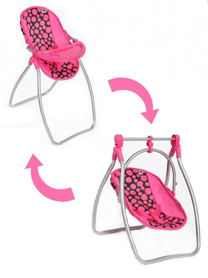 Jídelní židlička a houpačka 2v1 pro panenky Isabella.Charakteristika:- 2v1 židlička, houpačka- pevná, lehká, kvalitní konstrukce- bezpečnostní pásy- pultík- jednoduchý způsob složení i rozložení- snadno se mění z židličky na houpačku- krásné barvy, veselé vzory- věk 3+Rozměry:židlička: vxšxd cca...