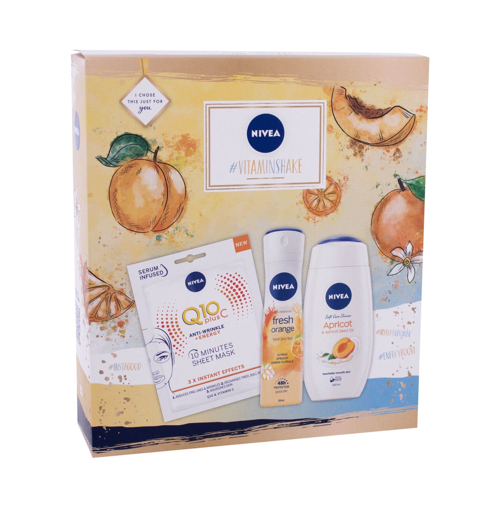 Nivea Vitaminshake sprchový gel Care & Apricot 250 ml + antiperspirant Fresh Orange 150 ml + textilní pleťová maska Q10 Plus C 1 ks