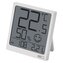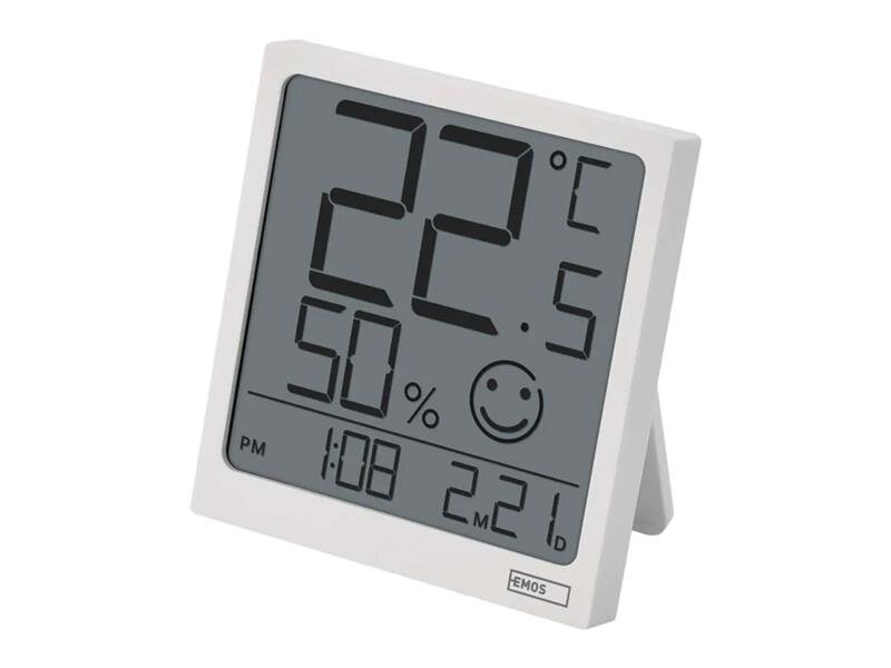 Teploměr v bílé barvě s hodinami řízenými Quarz krystalem. Zobrazuje vnitřní teplotu a vlhkost, hodiny, datum.