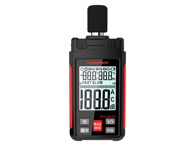 Ermenrich Seek DS20 to wielofunkcyjne urządzenie, które umożliwia pomiar poziomu hałasu, wilgotności i temperatury w środowisku wewnętrznym i zewnętrznym. Może być używane do monitorowania warunków w pomieszczeniach mieszkalnych, biurowych lub przemysłowych oraz do sprawdzania zgodności z normami. Miernik poziomu dźwięku szybko i dokładnie mierzy natężenie hałasu w zakresie 30-130 dB. Ponadto urządzenie określa temperaturę powietrza w zakresie -20 °C do 60 °C oraz wilgotność powietrza w zakresie 0 % do 99,9 %. Dostępne są funkcje zatrzymania obrazu aktualnie zmierzonej wartości oraz zapisywania wartości granicznych. Urządzenie wymaga zasilania trzema bateriami AAA (nie są dołączone). W celu oszczędzania energii miernik hałasu wyłącza się automatycznie po 10 minutach bezczynności. W razie potrzeby można wyłączyć tę funkcję. Oprócz wyświetlania zmierzonych wartości na ekranie dostępny jest wskaźnik rozładowania baterii.