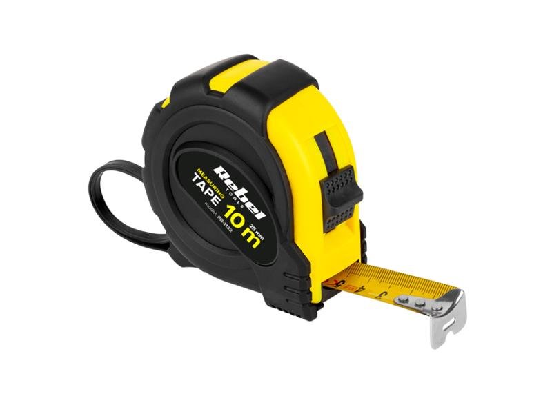 Miara zwijana Rebel to przyrząd pomiarowy, który powinien być częścią zestawu narzędzi każdego majsterkowicza. Należy mierzyć różne rodzaje materiałów i powierzchni przy większych remontach, jak i drobnych naprawach czy pracach domowych. Miara zwijana Rebel o zasięgu 10 m wykonana jest ze stali, która w połączeniu z solidną plastikową obudową zapewnia długą żywotność oraz odporność na uderzenia i inne uszkodzenia. Hak pomiarowy i przycisk blokady w połączeniu z dużą szerokością taśmy (25 mm) ułatwiają precyzyjne mierzenie dużych odległości bez podpory, dzięki czemu pomiar można wykonać samodzielnie w niemal każdej sytuacji.