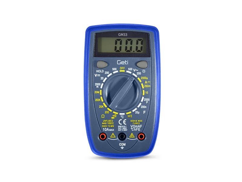 Multimetr GETI GM33B nalezne své uplatnění při měření široké škály elektrických veličin jako jsou například: napětí (DCV a ACV), proud (DCA), odpor, kapacita a mnoho dalších. Přehledný displej doplněný o podsvícení, zajišťuje snadnou a přesnou čitelnost naměřených hodnot i za horších světelných podmínek. Přístroj je také vybaven dalšími praktickými funkcemi, jako je indikace slabé baterie, ochrana proti přetížení, testování diod, měření kontinuity nebo testování tranzistorů, které dodávají multimetru uživatelsky přívětivý charakter, který díky kompaktním rozměrům a nízké hmotnosti zaručuje snadnou manipulaci i v těžko přístupných místech. Všechny tyto vlastnosti z tohoto přístroje činí všestranného pomocníka, nejen v dílnách, ale i domácnostech.