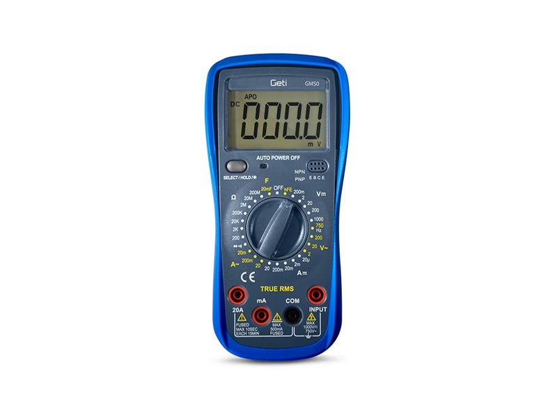 Multimetr GETI GM50G je profesionální přístroj vhodný k měření široké škály elektrických veličin jako jsou: napětí (DCV a ACV), proud (DCA a ACA), odpor, kapacita a další. Velký a podsvícený displej, zajišťuje snadné a dokonalé čtení zobrazených údajů i za zhoršených světelných podmínek. Přístroj je také vybaven dalšími praktickými funkcemi, jako je indikace slabé baterie, ochrana proti přetížení, testování diod nebo měření kontinuity, které dodávají multimetru uživatelsky přívětivý charakter. Díky svému tvaru a kompaktním rozměrům zaručuje tento přístroj snadnou a přesnou manipulaci. Všechny tyto vlastnosti z tohoto multimetru činí ideální přístroj nejen pro profesionály, ale také dílny a domácnosti.