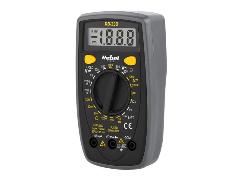 Multimetr REBEL RB-33B Obecné vlastnostiPodsvícený displejRuční změna měřicích rozsahůVýsuvný stojanZmrazení posledního měřeníIndikátor vybití bateriePolarita: automatickáVzorkovací frekvence: 2krát za sekunduMaximální odečet: 1999Velikost displeje: 45 x 21 mmProvozní...