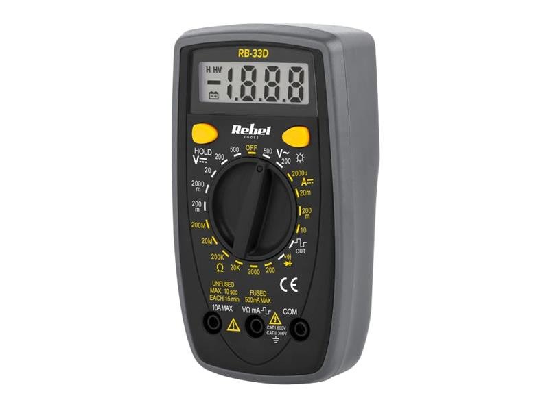 Multimetr REBEL RB-33D Obecné vlastnostiPodsvícený displejRuční změna měřicích rozsahůVýsuvný stojanZmrazení posledního údajeIndikátor vybité bateriePolarita: automatickáVzorkovací frekvence: 2krát za sekunduMaximální odečet: 1999Velikost displeje: 47 x 15 mmProvozní...