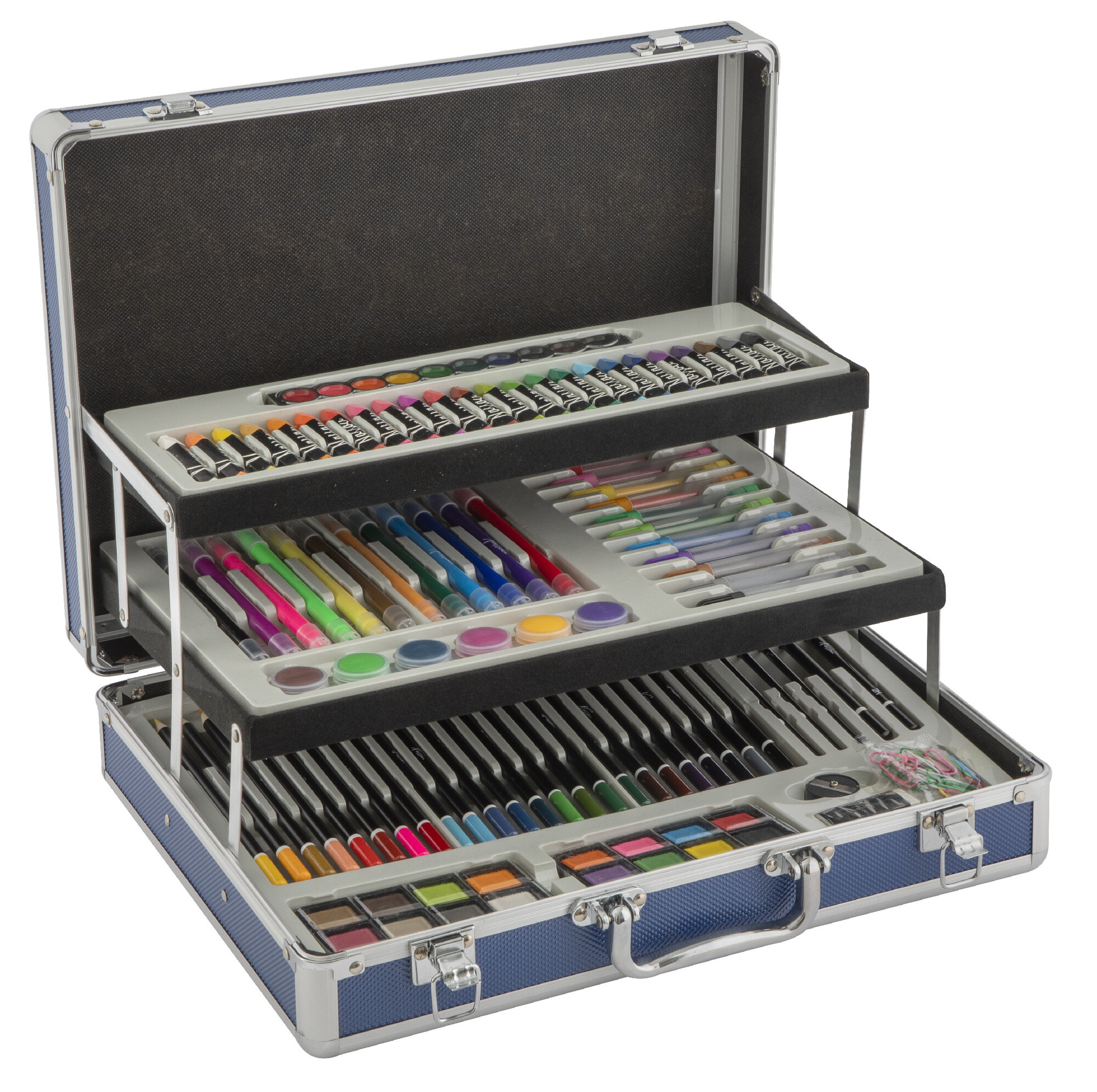 Balení obsahuje:24 pastelek,12 oboustranných fixů,12 fixů,24 pastelů,6 akrylových barev,gumu,ořezávátko,sponky na papír,16 akvarelových barev,tužky HB, 2B,olejové barvy. przeczytaj całość