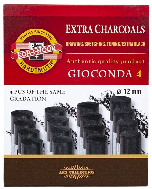 Czarny węgiel prasowany. Doskonały do swobodnych ekspresyjnych prac graficznych i szkiców niewymagających odwzorowania wielu szczegółów. Sprawdza się w rysunkach na dużych formatach.- Gioconda węgiel prasowany - Zestaw zawiera 4 sztuki węgla w twardości 4 przeczytaj całość