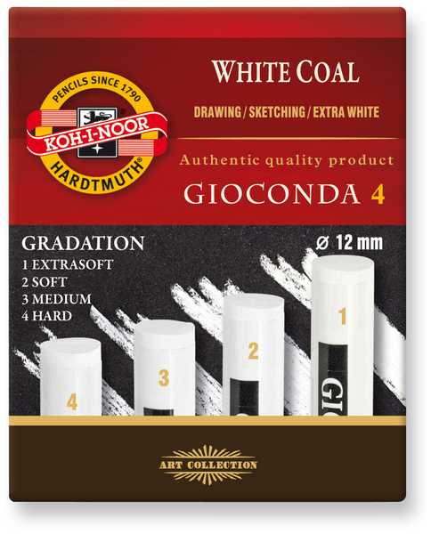 Biały węgiel prasowany. Doskonały do swobodnych, ekspresyjnych prac graficznych i szkiców niewymagających odwzorowania wielu szczegółów. Sprawdza się w rysunkach na dużych formatach.- Gioconda biały węgiel prasowany - Zestaw zawiera 4 sztuki węgla w twardościach: 1, 2, 3 przeczytaj całość