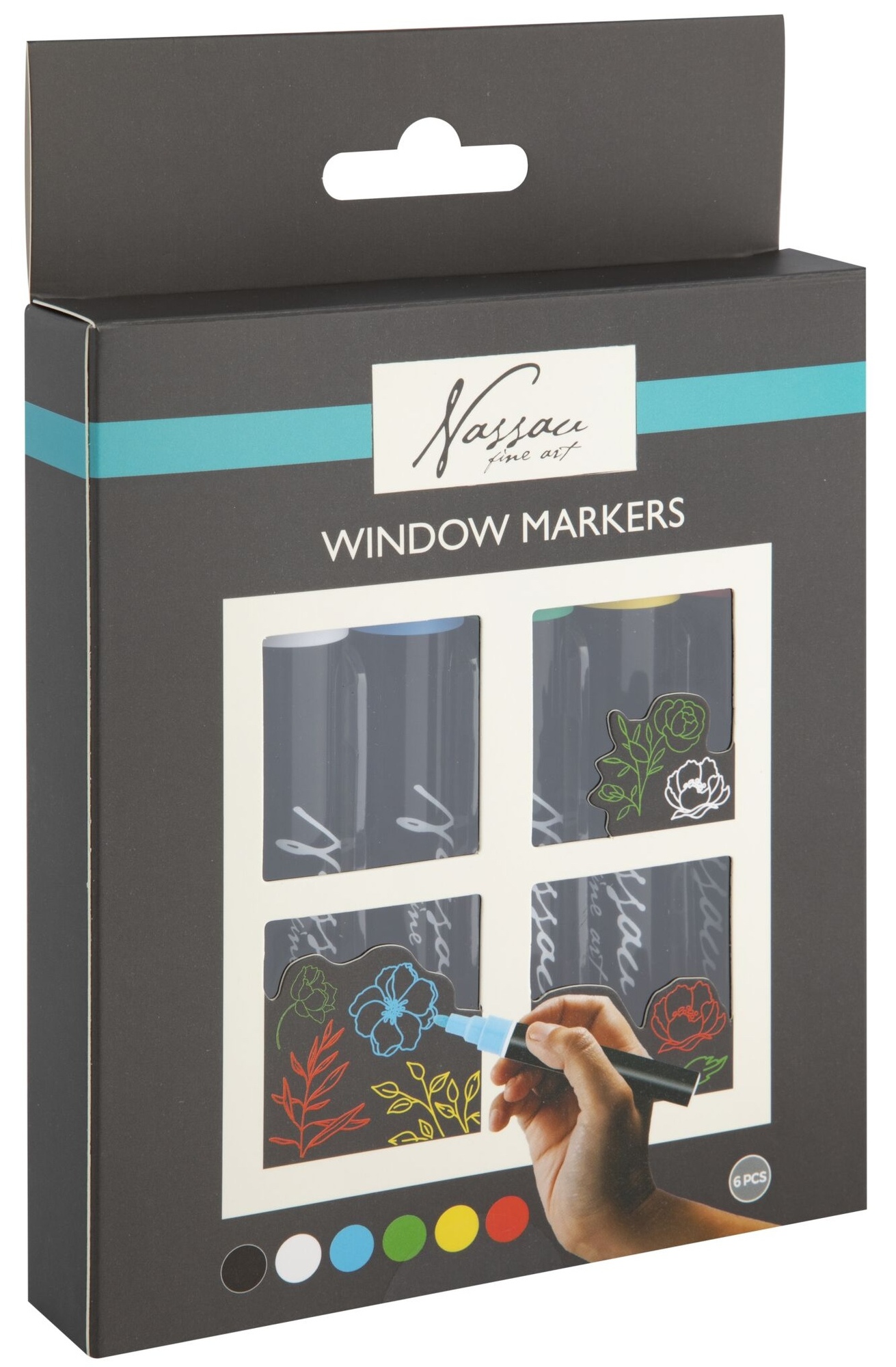 Odkryj uniwersalne kredowe markery do okien Nassau Fine Art - zestaw 6 kolorów (biały, czarny, niebieski, zielony, żółty, czerwony) dla dzieci i dorosłych. Dzięki dwustronnej końcówce (okrągła i ścięta, 3-5 mm) możesz łatwo tworzyć cienkie i grube linie zgodnie ze swoim wzorem.