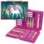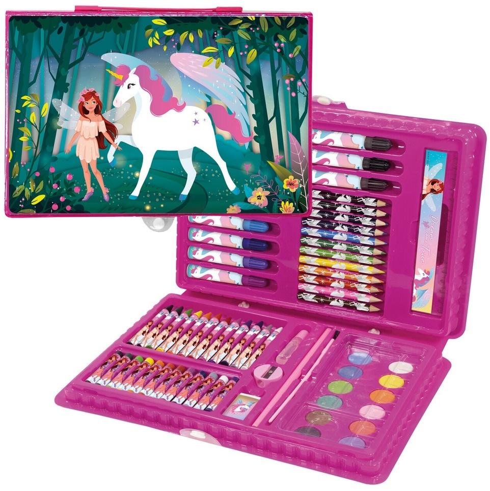 Zestaw artykułów plastycznych w walizce. W skład zestawu wchodzą: linijka, 12 pisaków, 12 kredek ołówkowych, 12 farb akwarelowych, 1 pędzel, 1 ołówek, klej, temperówka, gumka do mazania, 12 kredek woskowych, 12 pasteli woskowych + kolorowanka (4 kartki) + przeźroczysta paleta. przeczytaj całość