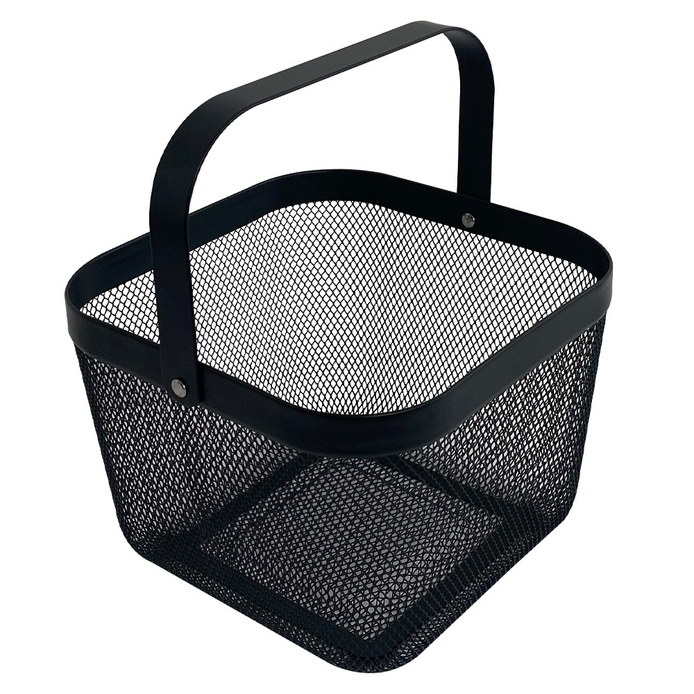 Druciany kosz o kwadratowym kształcie, odpowiedni do biura lub pracowni.