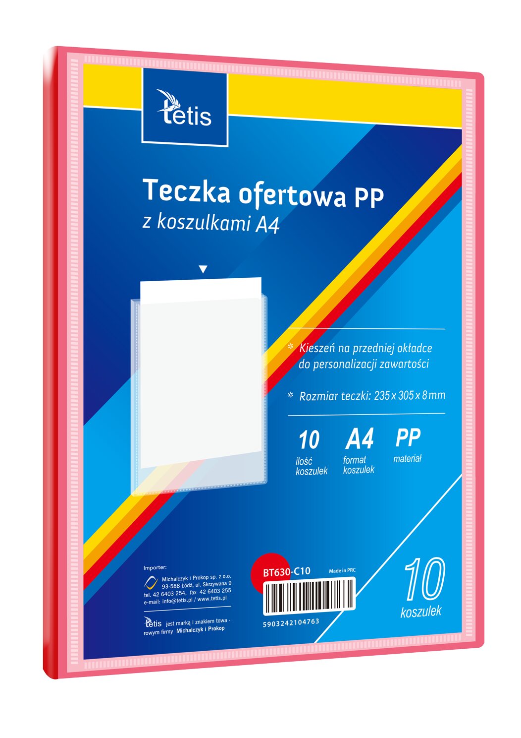 Teczka ofertowa A4 BT630Teczka ofertowa PP z koszulkami. Posiada grzbiet i kieszeń opisową na przedniej okładce, format A4. Wymiary teczki: 305x235 mm, grubość tworzywa PP: 0,35 mm (dla grzbietu 8 mm i 15 mm) i 0,40 mm (dla grzbietu 25 mm i 30 mm). Opakowanie: folia 1 szt. przeczytaj całość