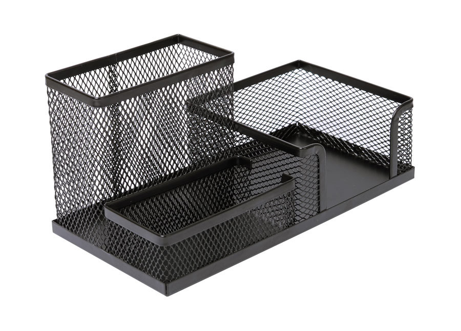 Czarny metalowy organizer o wymiarach 20,5 x 9,5 x 10 cm, z miejscem na długopisy, przegródką na akcesoria biurowe i kostką z karteczkami samoprzylepnymi. przeczytaj całość