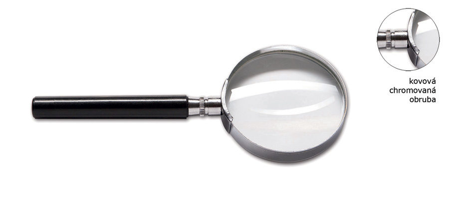 Lupa z metalową ramką i szklaną soczewką. Wymiary: średnica 90 mm, wysokość 13 mm, długość 22 cm. przeczytaj całość