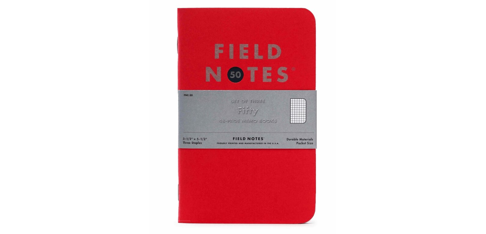Poznámkový blok Field Notes FNC-50 Fifty s klasickou obálkou "Red Hot" od French Paper Co. so strieborným kovovým metalickým atramentom obklopujú 48 strán v štvorcovom rozložení.