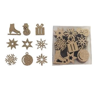 Sada dekoračních přízdob. Sada obsahuje 72 přízdob. Rozměry : 2 - 3,5 x 0,4 cm, výška 3 - ,5 cm. Barva : zlatá. Materiál : flís. przeczytaj całość