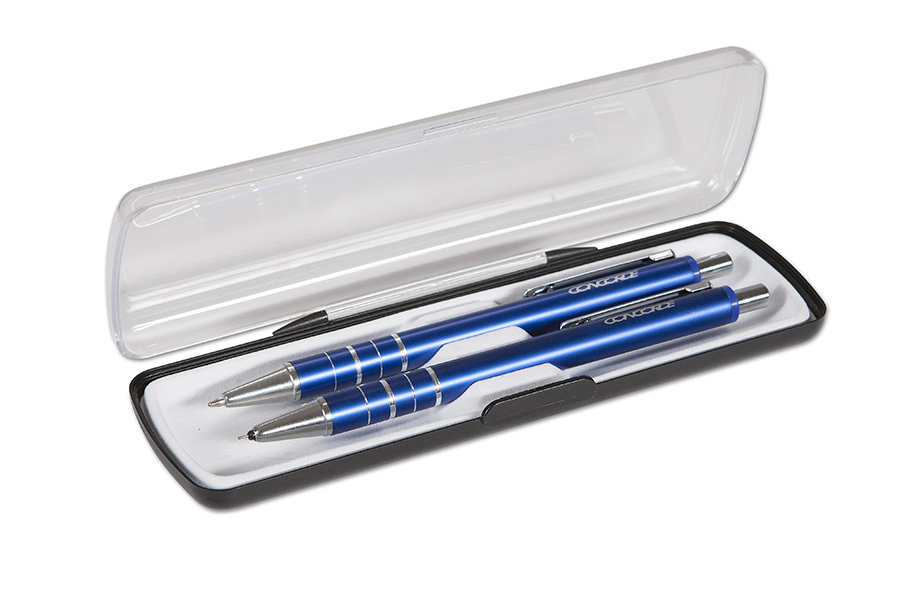 - Korpus długopisu i ołówka z anodowanego aluminium w niebieskim kolorze.