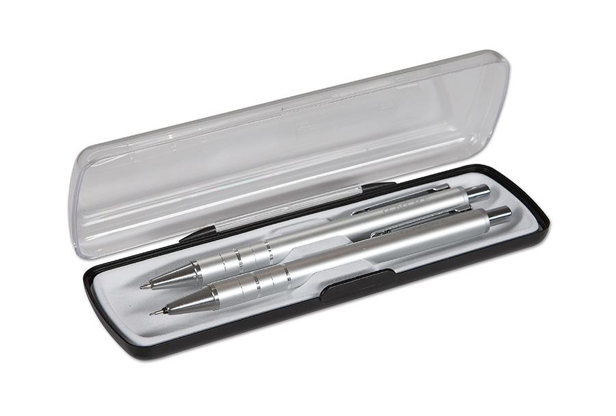 Dárková sada kuličkového pera a mechanické tužky 0,5mm dodávaná v plastové krabičce, lesklé tělo z eloxovaného hliníku, plastová náplň A3 modrá przeczytaj całość