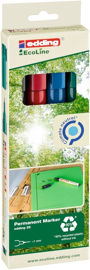 Permanentní popisovač edding 25 z ekologické řady EcoLine má tělo vyrobené nejméně z 90 % z recyklovaných materiálů. Je vhodný pro popis téměř všech materiálů (sklo, umělá hmota, kov, papír, karton, dřevo). Rychleschnoucí, světlostálý, voděodolný a otěru odolný inkoust na alkoholové bázi...