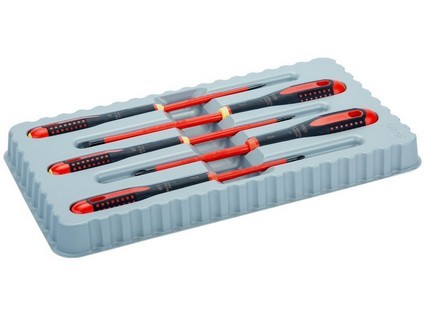 Sada elektro šroubováků (1000 V) 5dílná pro šrouby s drážkou a křížové šrouby (Phillips). Ergonomicky vyvinutá 3-složková rukojeť z polypropylenu a termoplastického elastomeru.Trvalé barevné značení na obou koncích rukojeti usnadňuje výběr šroubováku pro příslušný šroub.provedení: matný...