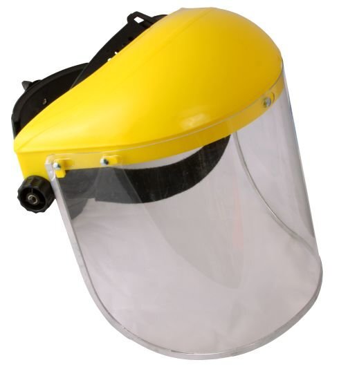 Przezroczysta osłona ochronna z poliwęglanowym wizjerem, łatwe dostosowanie rozmiaru dzięki obrotowemu pokrętłu, opaska na czoło z przodu, CE EN 166. przeczytaj całość