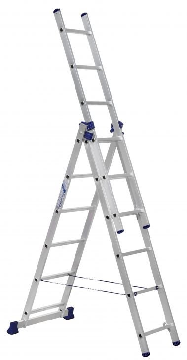Třídílný univerzální hliníkový žebřík jsou nepostradatelným pomocníkem v každém domě, chalupě nebo na zahradě.Žebřík je možné použít jako příložný opěrný žebřík, výsuvný žebřík dvojitý nebo trojitý, štafle a předsunuté štafle. Žebřík je vybaven protiskluzovými paticemi.Max. nosnost 150 kg....