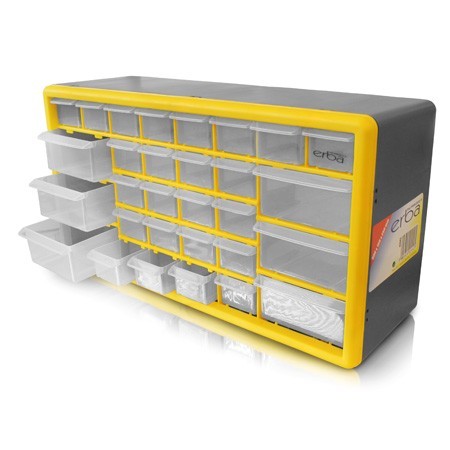 samostatný organizér na drobné i větší součástkyMateriál: PP plastbarva: šedá / žlutá / transparentnírozměry: 50 x 16 x 25 cm30 šuplíků ruzných velikostí przeczytaj całość