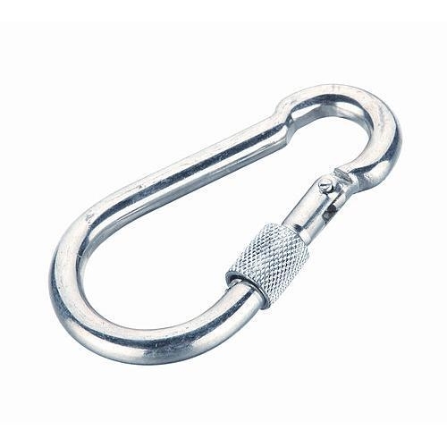 Metalowy hak, zwany również karabińczykiem, służy do zabezpieczania. Nadaje się do mocowania i kotwienia, na przykład huśtawek do ich konstrukcji itp. Przez karabińczyk przeciąga się obie części, które należy połączyć. Następnie prostym ruchem obrotowym dokręć nakrętkę, która pełni funkcję górnej osłony połączenia karabińczyka. Długość 80 mm, średnica 8 mm. EAN 8584163002092