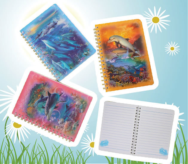 Veselý a hravý bloček s motivem moře a jeho obyvatel. Zápisník má tři různobarevné motivy delfínů. Modrý, růžový, zlutý. Papírový blok má pevnou plastovou obálku a plastovou kroužkovou vazbu. Velikost: 105 x 150 mm. Stránky jsou nalinkované a ve spodním rohu je obrázek delfína. Vhodný jako školní pomůcka, úkolníček, diář, deník, ale i mnoho dalších využití.