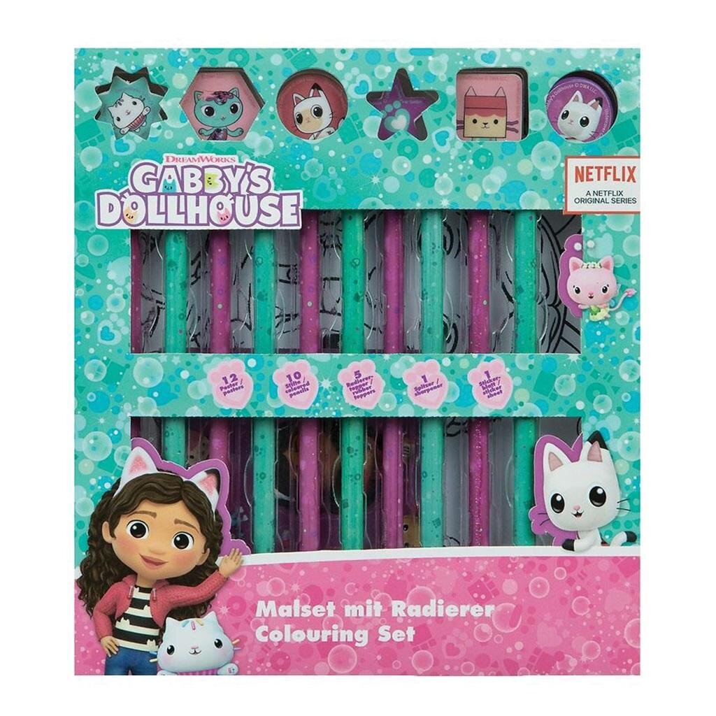 Zestaw do Kolorowania z Naklejkami, 29el. Koci Domek Gabi Zestaw kolorowanek to wymarzony prezent dla każdego malucha. Znajdują się w nim zarówno kredki, kolorowanki z wizerunkami bohaterów ulubionej bajki Koci Domek Gabi, jak również naklejki ozdobne oraz temperówka i gumki. Tylko wyobraźnia...