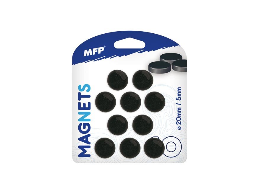 Kulatý černý magnet o průměru 20 mm a tloušťce 5 mm, balený v blistru. Je určen pro různé praktické použití, například na magnetické tabule nebo pro organizaci kovových předmětů v kanceláři či domácnosti.Balení: 10 ksBarva: černáVelikost: O 20 mmVAROVÁNÍ: Nevhodné pro děti do 3 let. Obsahuje malé...