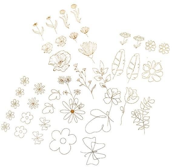 Naklejki PVC matowe, z przezroczystym tłem. Wzór: złocone delikatne motywy kwiatowe, eleganckie i minimalistyczne.Idealne do ozdabiania albumów, pamiętników, zeszytów i kartek. Delikatne, złote wzory będą idealnym dopełnieniem realizacji w technikach scrapbookingu, cardmakingu czy decoupage....