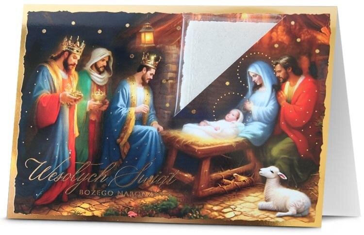 Świąteczna kartka z opłatkiem w zestawie.Kartka jest zdobiona złotą folią.W zestawie znajduje się koperta, kolorystycznie uzupełniająca się z kartką.Rozmiar złożonej kartki (szer x wys): 12 x 17 cm przeczytaj całość