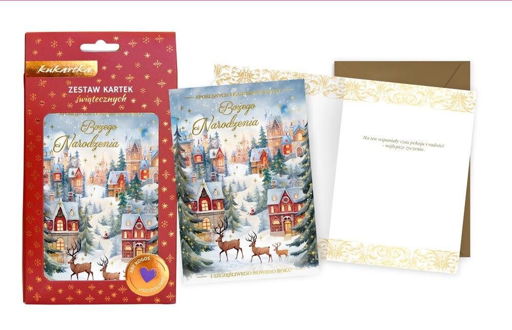 Zestaw kartek świątecznych ZKA-004 Zestaw zawiera 10 jednakowych kartek świątecznych z kopertami. Karnety są kolorowe i uszlachetnione metalizowaną folią hot-stamp. Ten zestaw to idealne rozwiązanie, aby mieć zawsze pod ręką zapas pięknych kartek świątecznych, gotowych do wręczenia bliskim i...