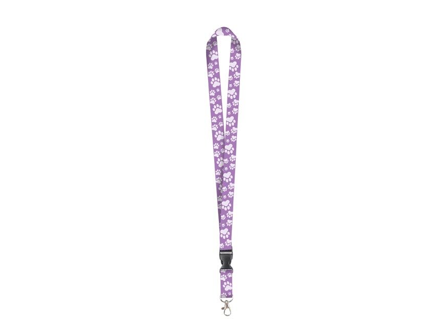 Brelok na szyję - Paws. Delikatny fioletowy wzór z białymi śladami łap nadaje brelokowi zabawny i przyjazny wygląd. Brelok doskonale nadaje się do bezpiecznego noszenia kluczy, kart identyfikacyjnych lub małego pendrive'a. Szybkozłączka umożliwia łatwe odłączenie kluczy lub karty bez konieczności zdejmowania całego breloka z szyi. Solidny karabinek zapewnia pewne przymocowanie kluczy i innych drobiazgów. Wykonany z lekkiego, przyjemnego materiału, który zapewnia wygodę nawet przy całodziennym noszeniu.