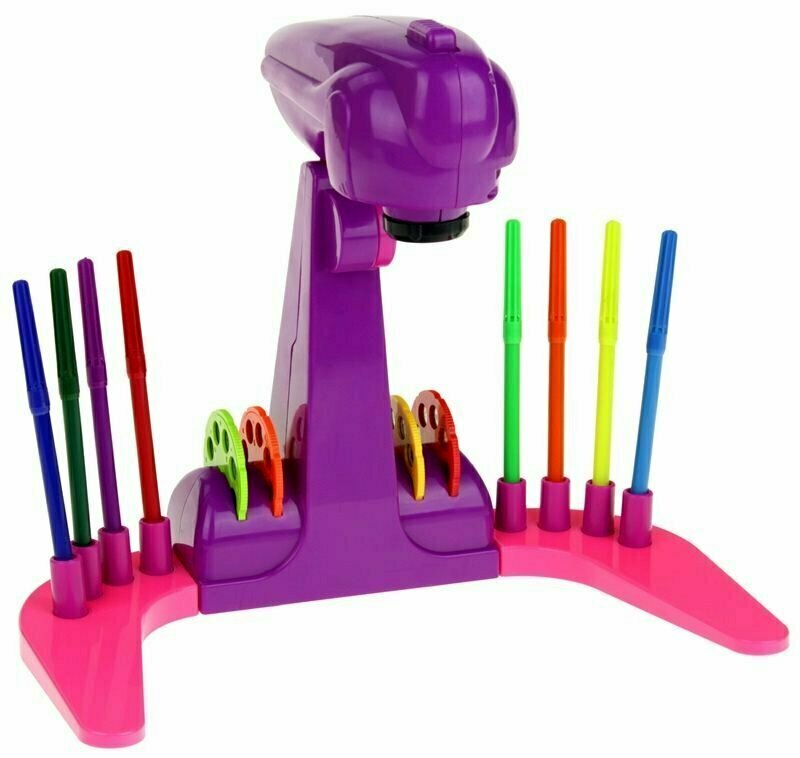 Fioletowy projektor do rysowania z zestawem różnych slajdów. Wystarczy, że ustawimy kartkę pod rzutnikiem oraz zamontujemy wybrany obrazek. Wówczas wyświetli się on na kartce i ułatwi rysowanie, ponieważ dziecko ma zarysowane kontury i kolory danej grafiki. Dostępne są aż 32 wzory (zwierzątka,...