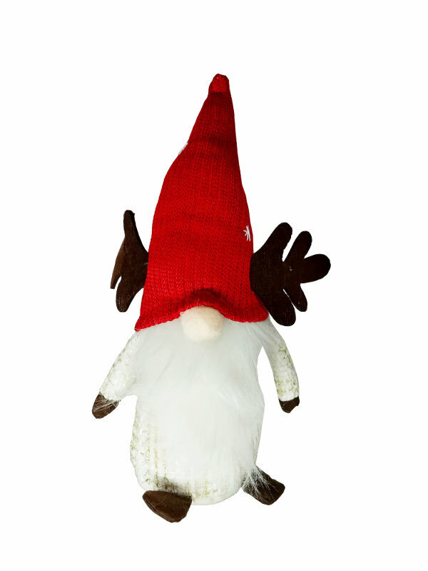 Świąteczny krasnal o wysokości ok. 40 cm w wełnianym ubranku. Ma nasuniętą na głowę dużą, spiczastą czapkę z porożem renifera, z której wystaje jedynie nos i długa broda. Krasnal ma doszyte rękawiczki i buciki. Posiada miękkie wypełnienie. U samej podstawy zabawka jest cięższa, co sprawia, że...