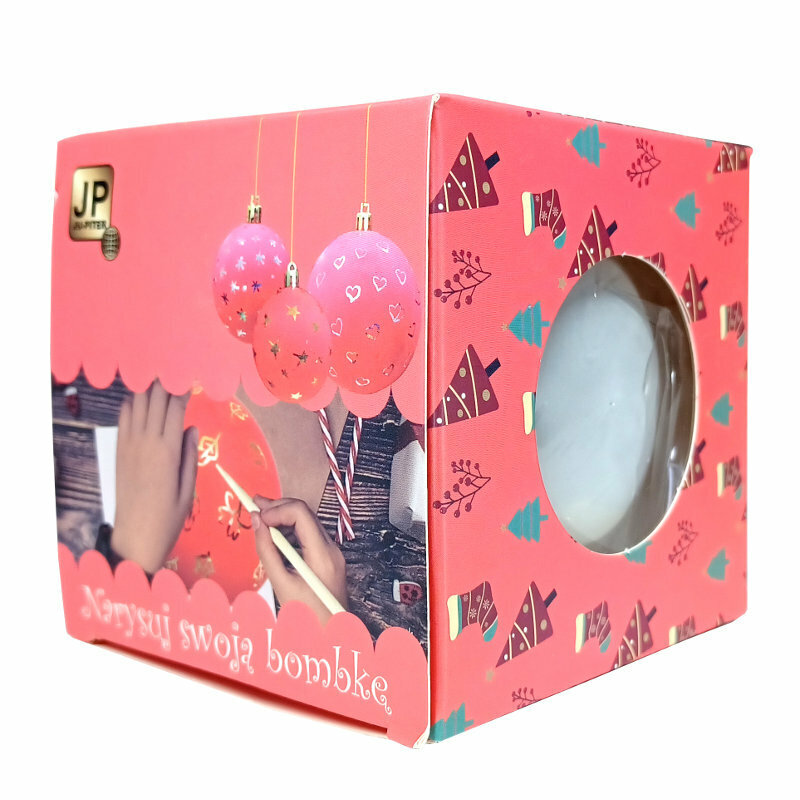 Bombka z patyczkiem do nakładania barwnika firmy JU-PITER. W pudełeczku znajduje się niewypełniona wzorami biała bombka. Została pokryta specjalnym materiałem, na który możemy precyzyjnie nanieść barwnik.Rodzaj pojedynczego opakowania: kartonik z plastikowym, przezroczystym okienkiemRozmiar opakowania zbiorczego (9 bombek):27x26x9cmRozmiar pojedynczego zestawu (1 bombka):8x8x8cmWiek: 3+